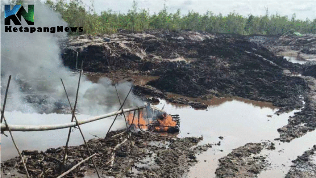 ketapangnews.web.id – Fajar menyingsing di Kecamatan Matan Hilir Selatan, Kabupaten Ketapang. Kabut tipis menyelimuti tanah yang tercabik menjadi kolam-kolam keruh. Di balik kabut, deru mesin tambang emas ilegal terdengar, menandai awal hari bagi para penambang yang hidup dari butiran emas kecil.
